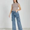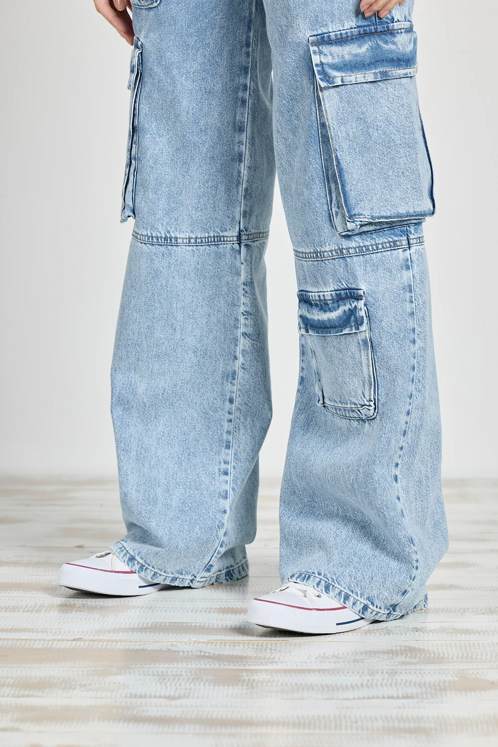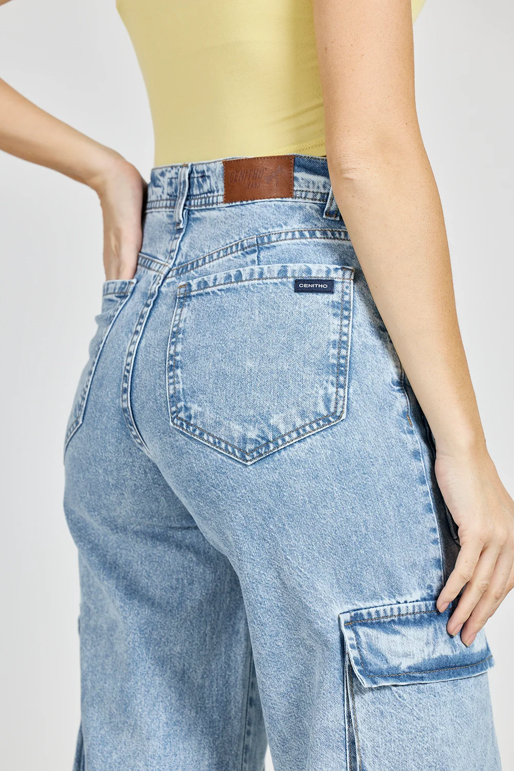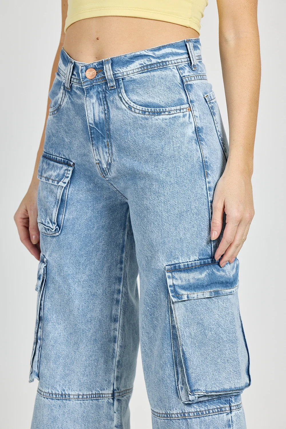Jean Cenitho Wide Leg Cargo Bolsillo delantero Celeste Rígido