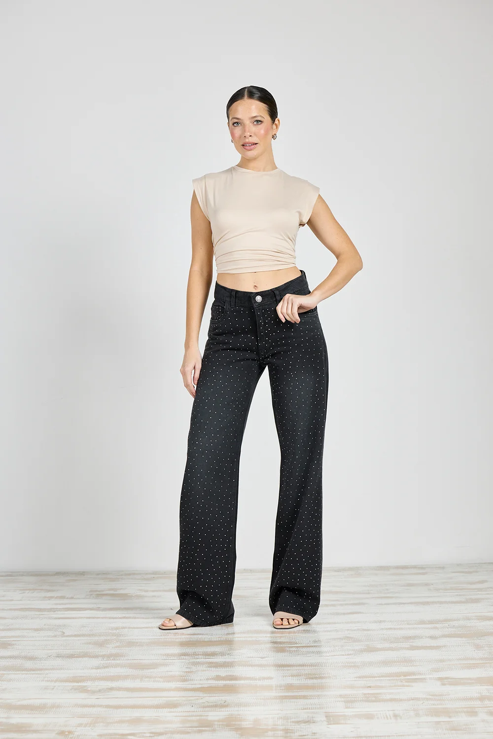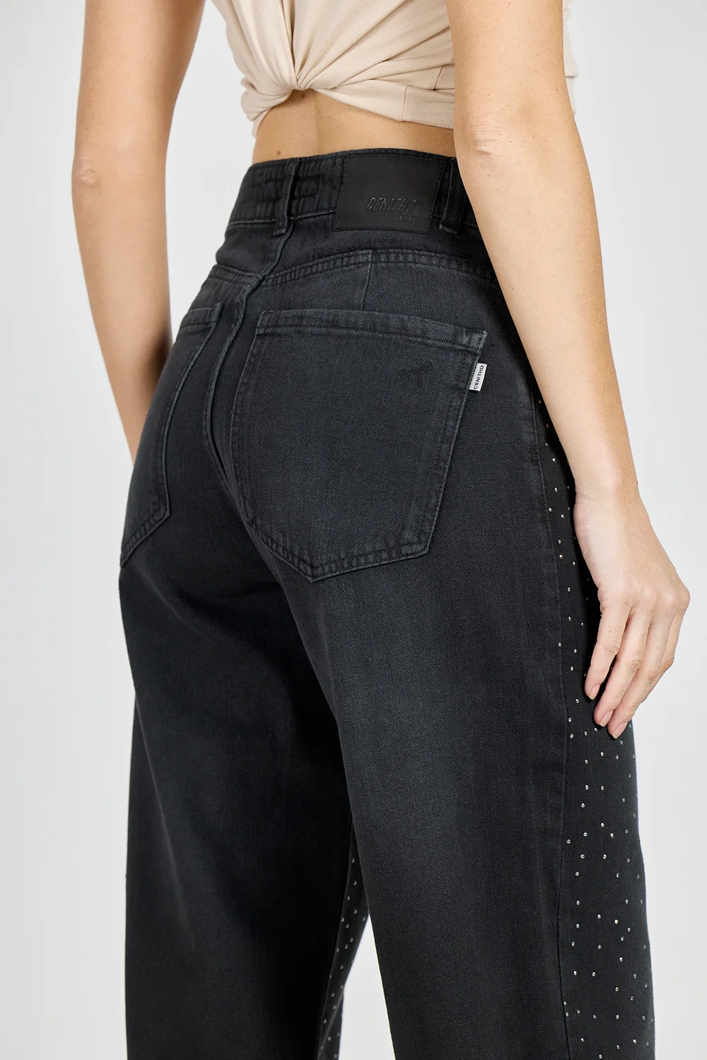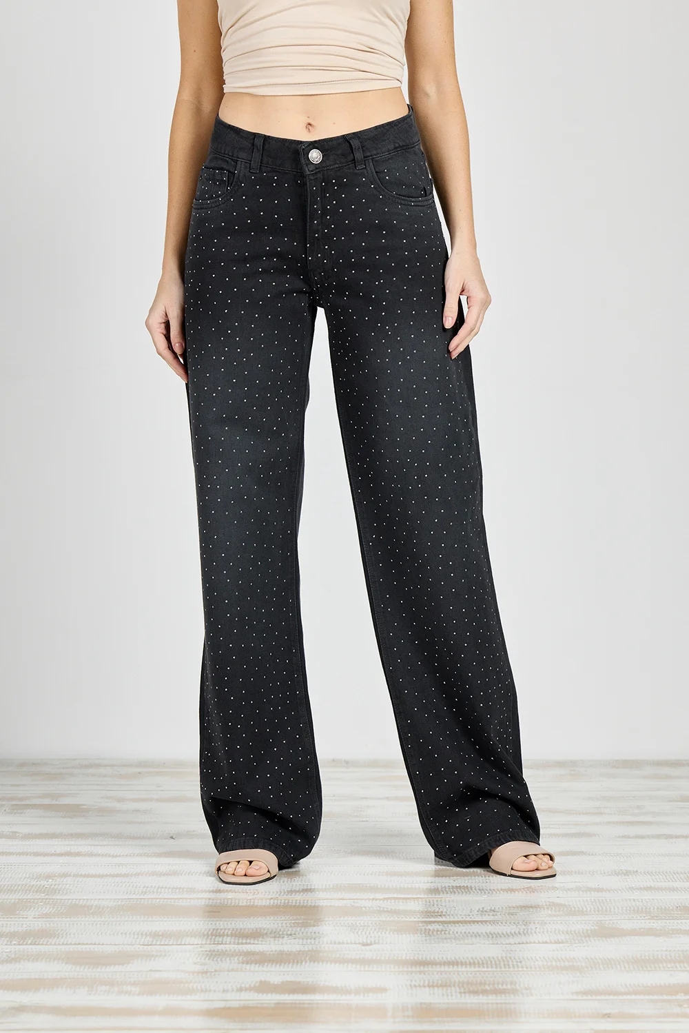 Jean Cenitho Wide Leg con Strass Brillo Negro Rígido